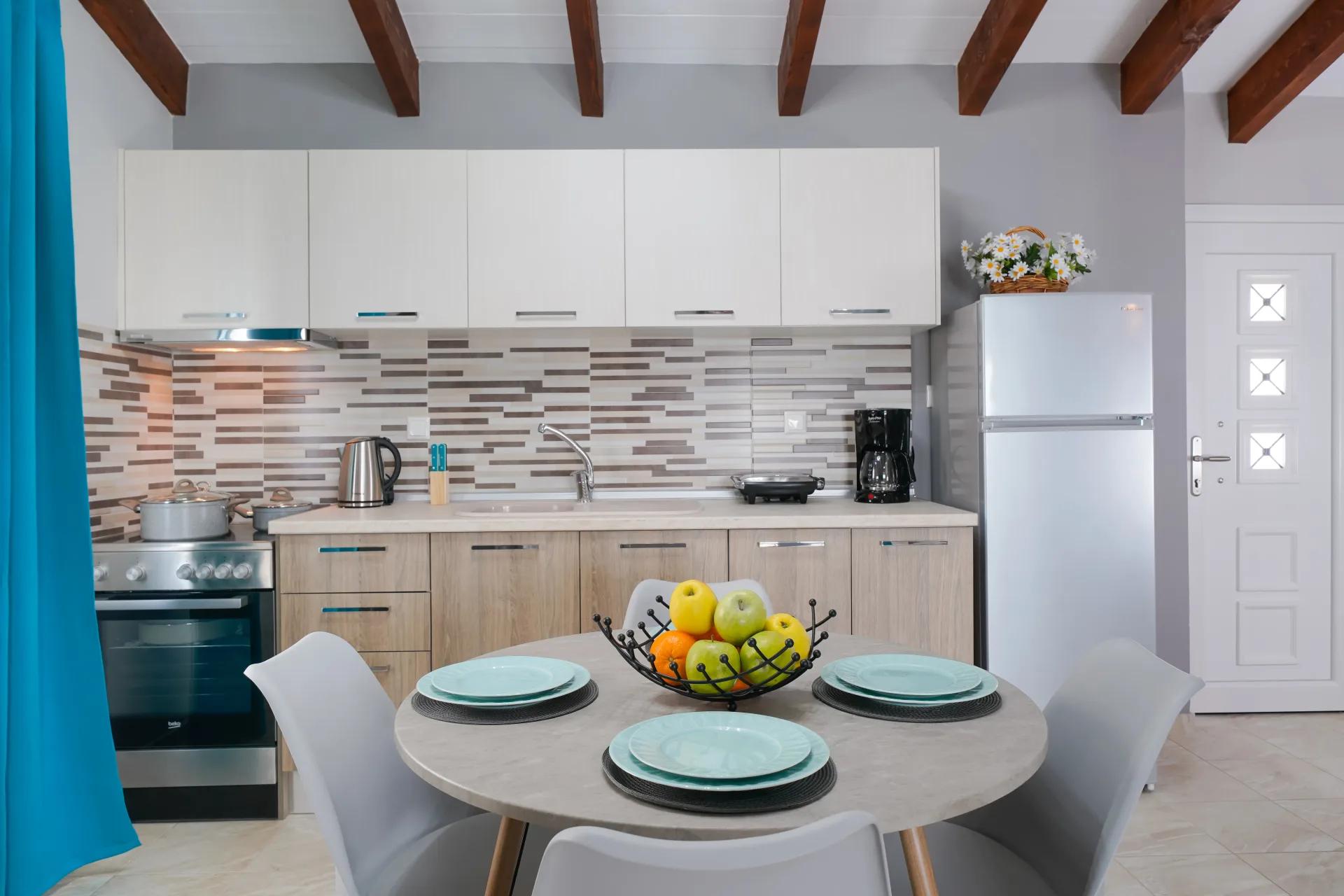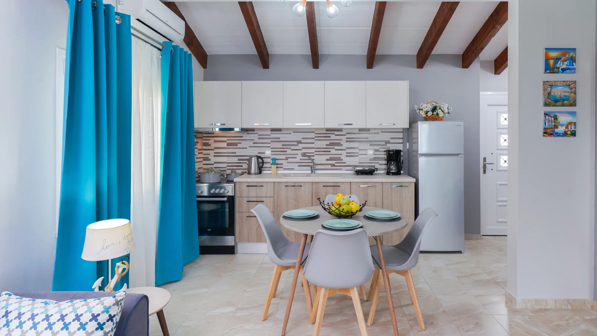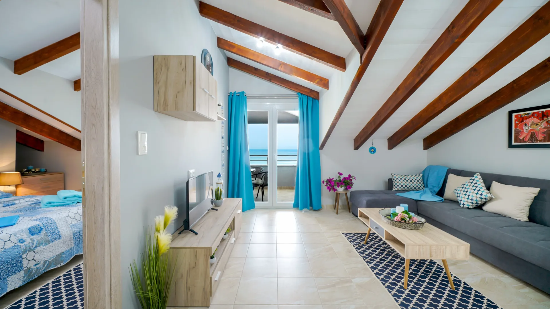 First-floor apartment just across the street from the beach, in the centre of Skala Maries.